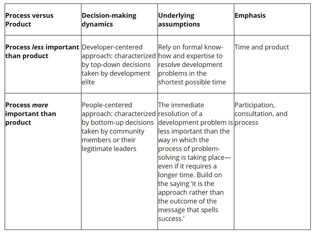 Botes and van Rensburg point out, though, that “hasty technocrats” are not the only ones who are impatient. Potential beneficiaries, too, want speedy, tangible delivery. The authors suggest that both need to realize, however, that “product without process runs the risk of doing something communities do not want or need, or cannot sustain.”(38)