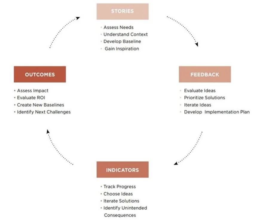 IDEO suggests a “Learning Loop,” shown below. At this point, the focus is on Indicators, to track progress, choose ideas, iterate solutions, and identify unintended consequences.(3)