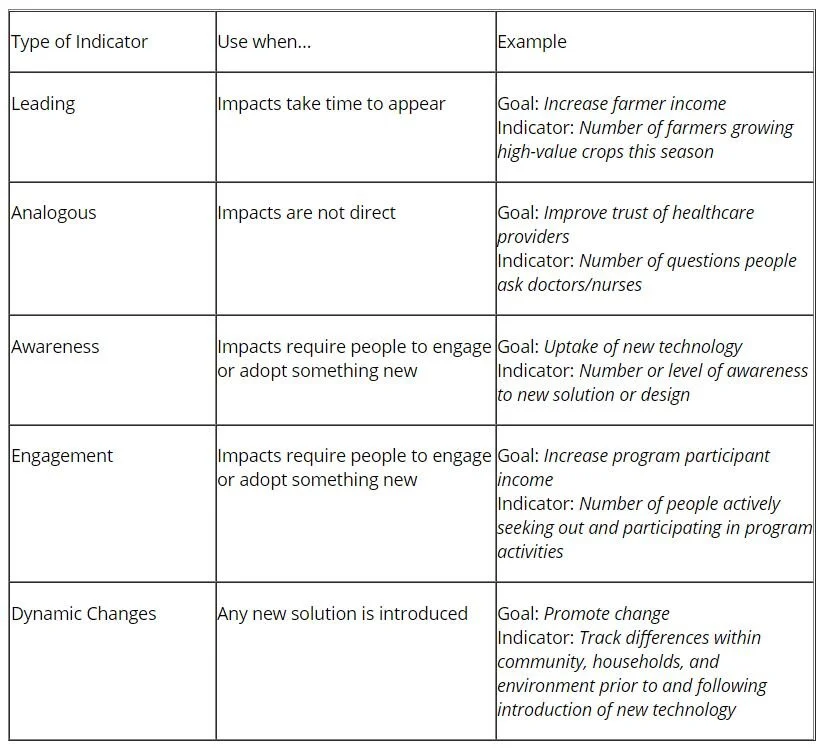 Specifically, these indicators may be positive or negative, and intended or unintended. It is important to view all categories to determine the full scale of impact. The following chart lists types, descriptions, and examples of indicators, as taken from the IDEO Toolkit: